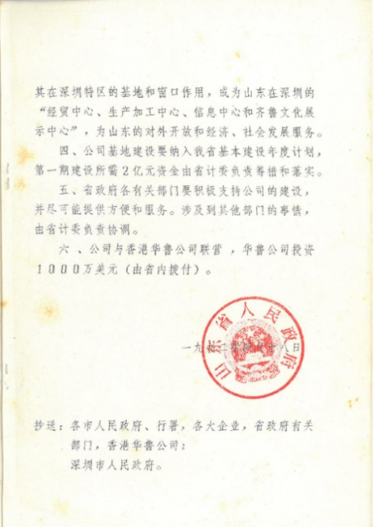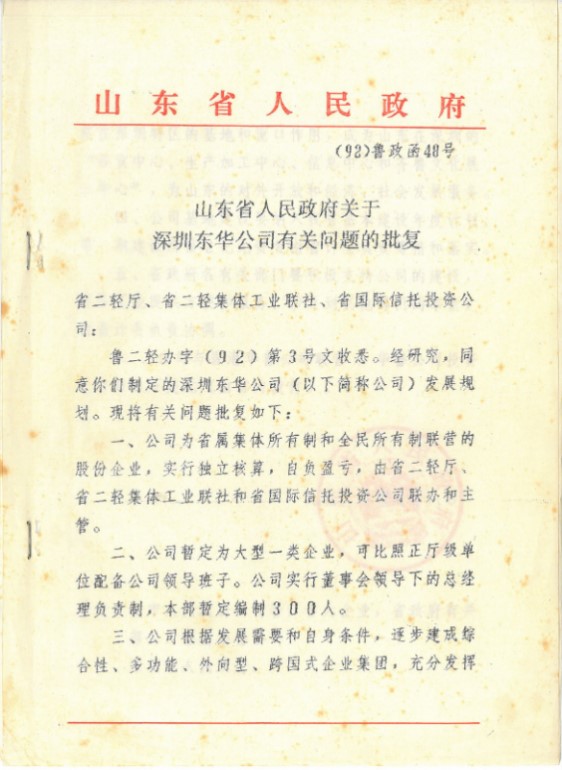 1992年,山東省政府下文批準(zhǔn)深圳東華為大型一類企業(yè),可比照正廳級單位配備公司領(lǐng)導(dǎo)班子,賦予4項(xiàng)職能,即:成為山東在深圳的“經(jīng)貿(mào)中心、生產(chǎn)加工中心、信息中心和齊魯文化展示中心”。1992年,時(shí)任山東省委書記姜春云同志蒞臨深圳東華指導(dǎo),要求公司建成山東省在深圳最大的綜合基地和“窗口”,為山東和深圳作出雙份貢獻(xiàn)。在曾經(jīng)的荒灘上,經(jīng)過一代代東華人不懈努力,我們建成了如今的深圳東華。