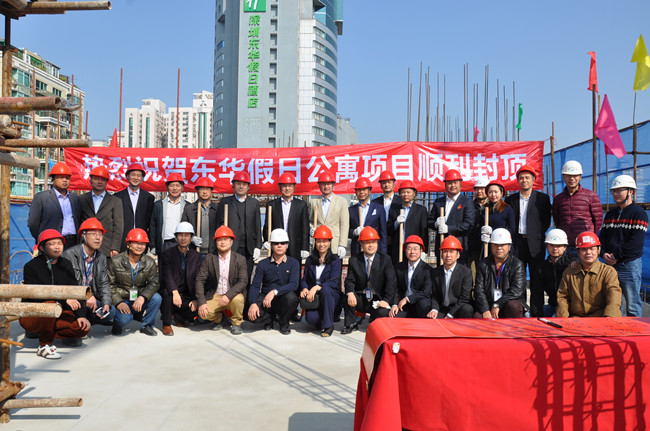12月16日上午,隨著最后一車混凝土的澆筑完成,深圳市東華假日公寓工程主體結(jié)構(gòu)順利完成封頂,施工現(xiàn)場,彩旗飄揚,掌聲雷動。深圳東華集團(tuán)領(lǐng)導(dǎo)、項目建設(shè)合作單位漢京集團(tuán)領(lǐng)導(dǎo)、施工單位恒泰基建設(shè)有限公司代表、合創(chuàng)監(jiān)理有限公司領(lǐng)導(dǎo)在東華假日公寓頂層B區(qū)封頂處共同為公寓大樓封頂,共同見證工程建設(shè)開工以來最為激動人心的階段性成果,并紛紛致辭表示祝賀。