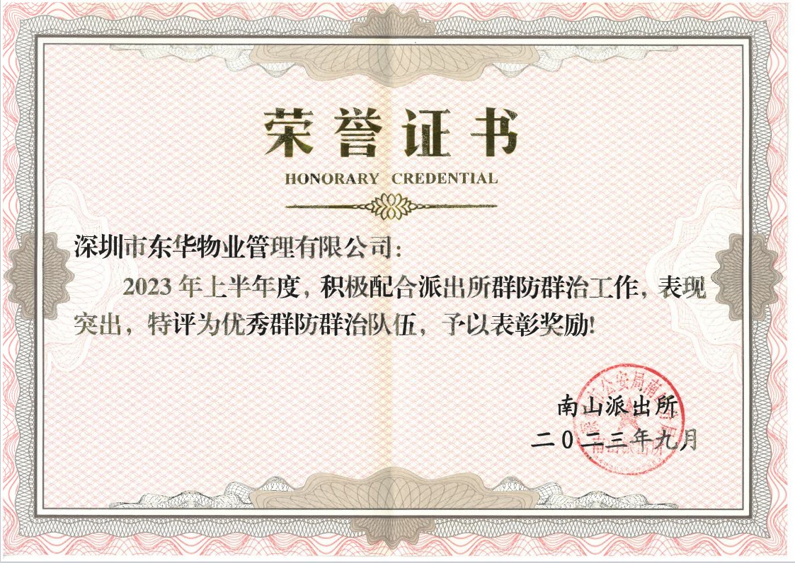 9月22日,南山派出所召開(kāi)2023上半年群防群治隊(duì)伍管理工作會(huì)議,東華物業(yè)公司因?qū)ι鐓^(qū)安全和秩序的杰出貢獻(xiàn)被評(píng)選為“優(yōu)秀群防群治隊(duì)伍”。