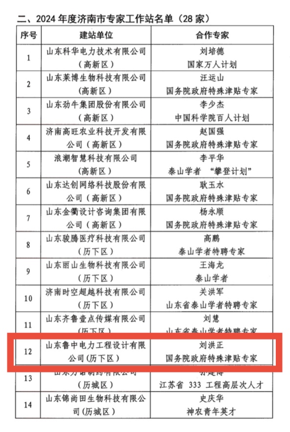 近日,濟(jì)南市科學(xué)技術(shù)協(xié)會(huì)公布2024年度濟(jì)南市院士專家工作站認(rèn)定名單,濟(jì)南國際人才創(chuàng)新中心入駐企業(yè)山東魯中電力工程設(shè)計(jì)有限公司成功認(rèn)定為2024年度濟(jì)南市專家工作站。