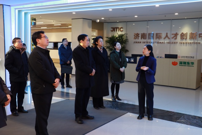 在濟南國際人才創(chuàng)新中心,孫中亮一行聽取了園區(qū)整體規(guī)劃及配套功能的詳細介紹,實地調(diào)研了園區(qū)內(nèi)科技路演廳、公共服務平臺、企業(yè)辦公區(qū)以及黨員活動中心,詳細了解了園區(qū)運營模式、平臺建設(shè)、政策服務體系、企業(yè)孵化成果、產(chǎn)業(yè)資源聚集等情況。在“歷下好成果”展廳,孫中亮一行參觀了齊魯醫(yī)院張運院士團隊研發(fā)的心磁成像設(shè)備、澳大利亞科學院院士查爾斯麥凱團隊研發(fā)的功能性營養(yǎng)食品、山東亞歷山大智能科技周軍教授團隊研發(fā)的云邊協(xié)同智能消殺機器人、山東大學生物醫(yī)學傳感工程技術(shù)研究中心研發(fā)的新一代高密度柔性可拉伸電極傳感器設(shè)備以及低空領(lǐng)域多旋翼無人機軍用及民用裝備等高科技成果,并對濟南國際人才創(chuàng)新中心在推動區(qū)域高新技術(shù)產(chǎn)業(yè)發(fā)展和科技成果轉(zhuǎn)化方面取得的成就給予高度認可。