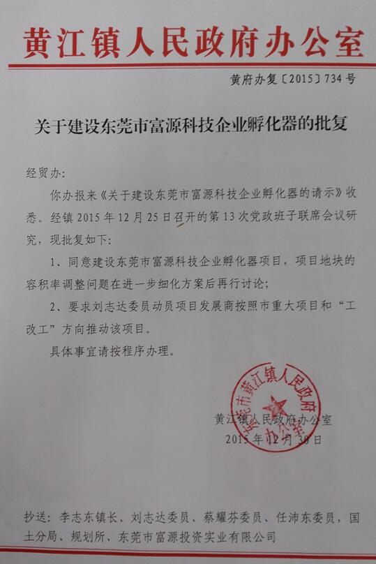 于2015年12月30日得到黃江鎮(zhèn)同意。經鎮(zhèn)2015年12月25日召開的第13次黨政班子聯(lián)席會研究,同意建設東莞市富源科技企業(yè)孵化器項目,項目地塊的容積率調整問題在進一步細化方案后再行討論;要求劉志達委員動員項目發(fā)展商按照市重大項目和“工改工”方向推動該項目。