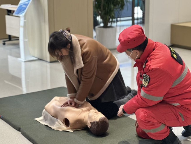 演練結束后,活動進入實操培訓環(huán)節(jié)。宋峰站長現(xiàn)場演示心肺復蘇(CPR)操作流程,從意識判斷、呼救求助,到胸外按壓、人工呼吸,逐一細致講解并手把手指導參訓人員練習。大家踴躍參與、認真揣摩,努力掌握“黃金4分鐘”內(nèi)的急救技能。隨后,參訓人員在專業(yè)人員指導下進行滅火器實操訓練,輪流上陣,精準撲滅模擬火源,切實提升了撲救初期火災的實戰(zhàn)能力。
