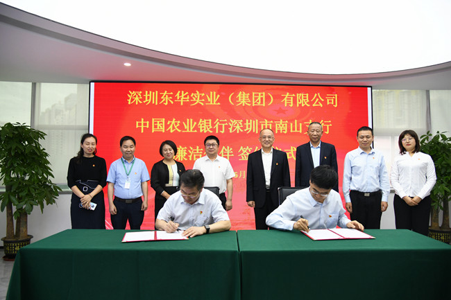 5月18日,深圳東華與中國(guó)農(nóng)業(yè)銀行深圳市南山支行在山東大廈四樓魯深新舊動(dòng)能轉(zhuǎn)換促進(jìn)中心展廳舉行了“廉潔伙伴”簽約儀式。