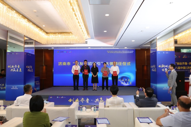 活動(dòng)中,山東省委組織部人才工作二處負(fù)責(zé)同志頒發(fā)了濟(jì)南市“校友雙招雙引大使”聘書,濟(jì)南市委組織部副部長、市委人才辦常務(wù)副主任王玉躍頒發(fā)了“海右伯樂”聘書,“粵港澳濟(jì)商產(chǎn)業(yè)聯(lián)盟”正式揭牌,與會(huì)領(lǐng)導(dǎo)共同啟動(dòng)大賽路演儀式。